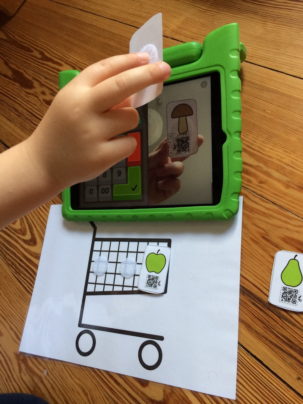 Ich habe aus den PDF-Dateien von Storest die QR-Codes für die Preise entnommen. Dies stellt eine kleine Fleißarbeit dar, wenn man mehrere verschiedene Preise zum Rechnen haben möchte. Ich fand die Möglichkeit der Selbstkontrolle der Summe mittels dieser App eine motivierende Sache. Zum Adventsmarkt kommt diese Art der Kasse zum Einsatz. Vor Jahren habe ich für den Tobii eine ähnliche Kasse erstellt.