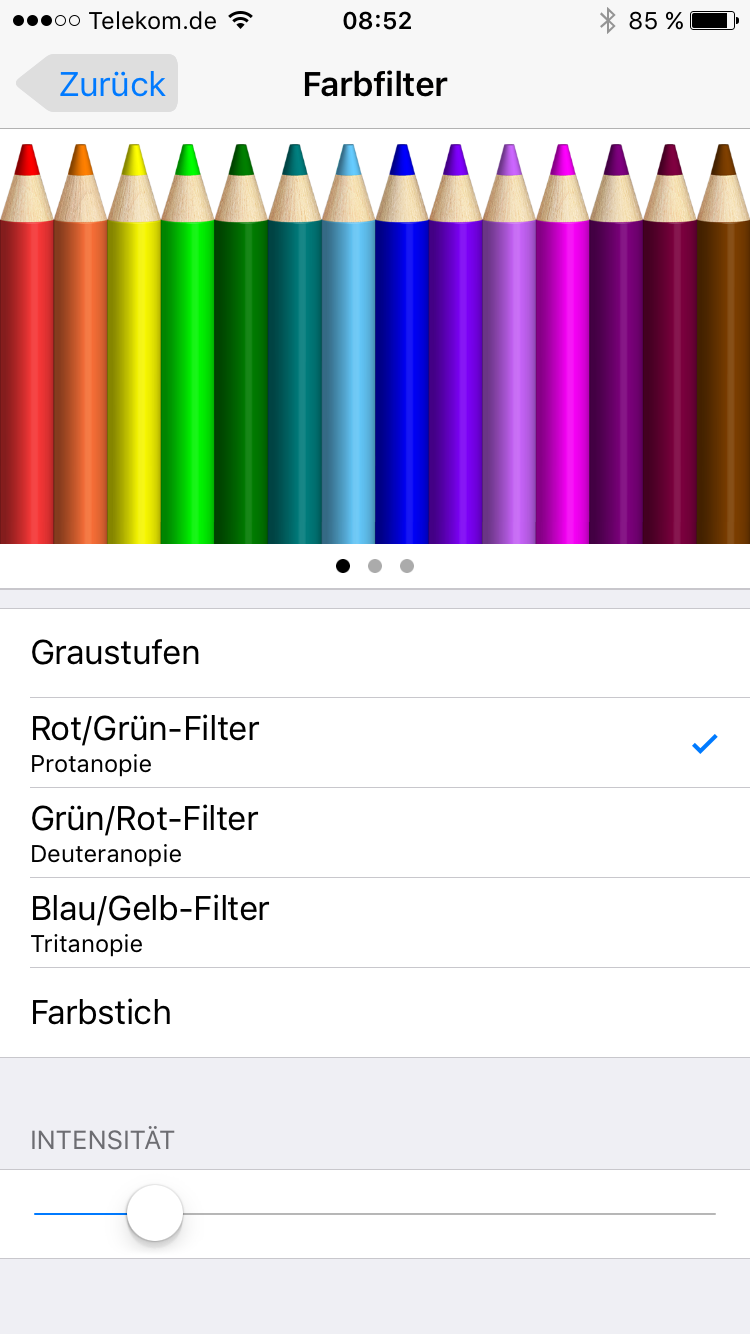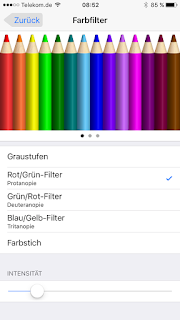 Nun kann man mit einem Dreifachklick diesen aktivieren. Die Kamera öffnet sich dabei, und man hat einen schnellen Zugriff. Wir finden unter den Startbildschirm der Bedienungshilfen die Displayanpassungen. In diesem Menü kann man die Farben des Screens individuell anpassen.