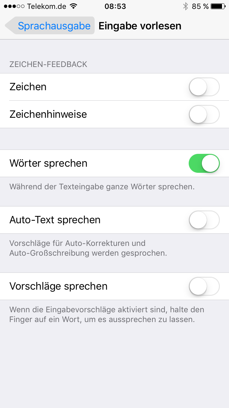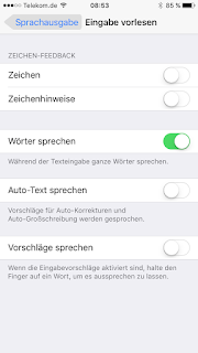 Eine spannende Sache gibt es auch neu: In der Sprachausgabe findet man Eingabe vorlesen. Dieses Feature ermöglicht, dass man ein auditives Feedback bekommt, wenn man schreibt. Wörter sprechen muss man hierbei aktivieren – dies funktioniert wie gewohnt in guter Qualität.