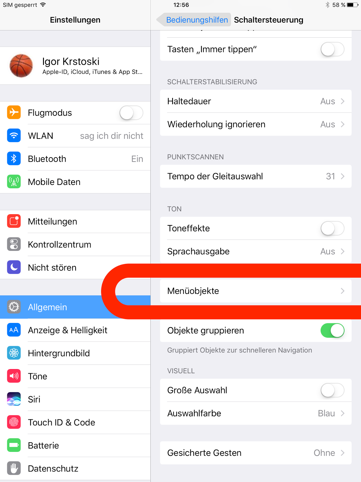 Danach geht ihr zurück zur Auswahl der Schaltersteuerung. In der Option „Menüobjekte“ lässt sich die Auswahl verfeinern. IdR werden sehr viele Menüobjekte fürs Scanning angezeigt (siehe nächstes Bild).