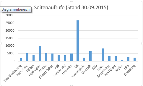 ich habe mir mal erlaubt, eine Diagramm zu erstellen, wie oft welche Unterseiten angeklickt wurden. Am häufigsten wurde die Unterseite Apps zu UK angeklickt. Gefolgt von den Top5-Apps sowie den Tipps, dann Deutsch und Mathe.Und auch die Apps-Listen stehen verhältnismäßig hoch im Kurs. Seht selbst: