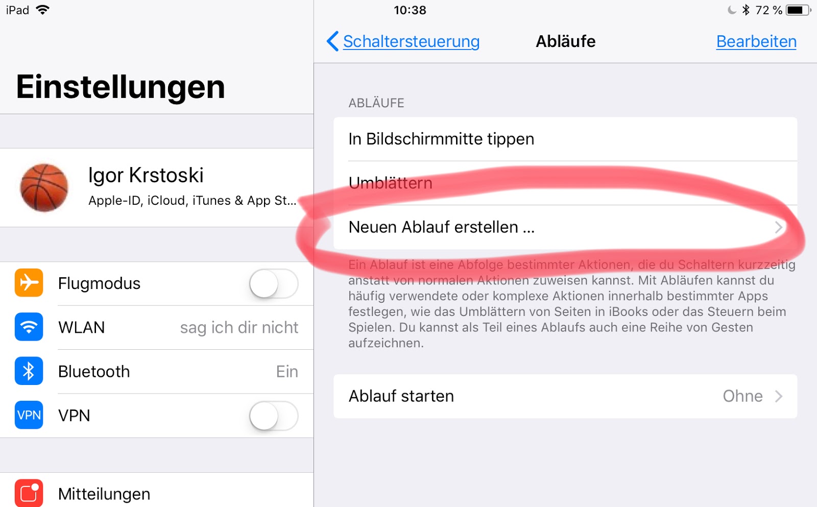 Dann muss man in den Bedienungshilfen unter der Schaltersteuerung einen Ablauf erstellen.
